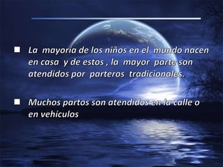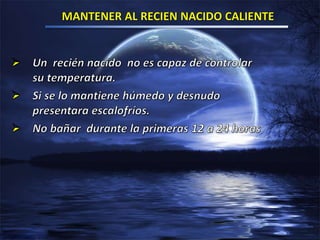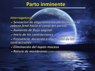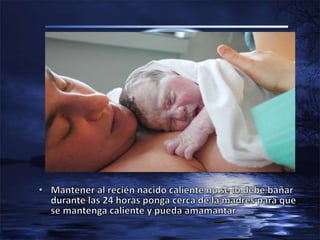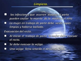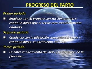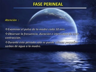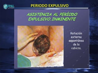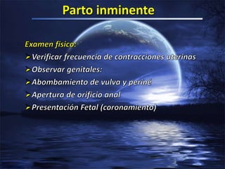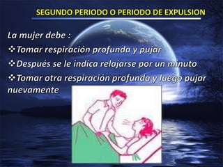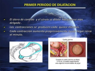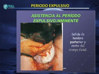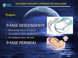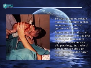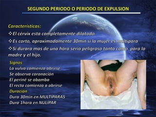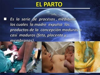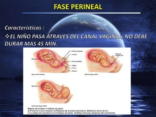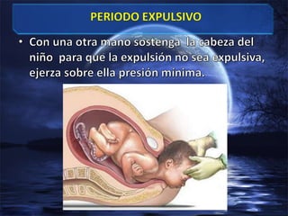 Este documento proporciona información sobre las contracciones regulares e irregulares durante el parto, así como instrucciones sobre cómo asistir el nacimiento de un bebé de manera segura. Describe los pasos a seguir, como proteger el periné de la madre, sostener la cabeza y hombros del bebé durante la salida, cubrir al recién nacido si el ambiente es frío, y examinar la presión y el pulso de la madre cada 15 minutos. También incluye detalles sobre la evaluación del recién nacido usando la escal