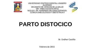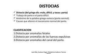 Este documento describe las distocias o partos difíciles, clasificándolas en tres tipos: por anomalías fetales, por anomalías de las fuerzas expulsivas y por anomalías del canal del parto. Se detalla cada tipo de distocia fetal, incluyendo anomalías del desarrollo, de presentación y de posición del feto, así como su diagnóstico y manejo. También se explican conceptos clave relacionados a las contracciones uterinas como tono, intensidad y frecuencia.