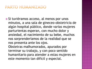 El documento describe la necesidad de un parto más humanizado donde los obstetras traten a las mujeres con más compasión y respeto durante este momento difícil y especial. También discute controversias sobre el parto natural sin intervenciones versus tener acceso a atención médica si surge alguna complicación. Un experto opinó que el parto es natural pero se necesita tener acceso a ayuda médica básica por si ocurren problemas y que se debe respetar el proceso natural siempre que sea posible atender cualquier complicación.