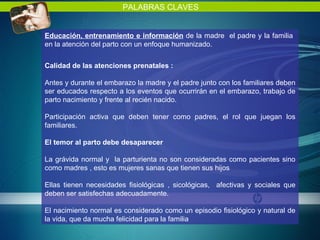 El documento discute un enfoque humanizado del parto que respeta los derechos de la mujer embarazada. Propone educar y entrenar a la madre, el padre y la familia sobre el embarazo y el parto. También promueve la participación activa de la madre y el padre durante el parto y cuidado del recién nacido, y evitar intervenciones innecesarias durante el trabajo de parto.