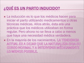 Este documento describe los diferentes métodos para inducir el parto, incluyendo romper las membranas, madurar el cuello uterino con medicamentos como misoprostol, y usar oxitocina. También discute los posibles riesgos de la inducción como contracciones muy fuertes, infecciones, problemas con el cordón umbilical, y en casos raros una ruptura uterina. La inducción prematura entre las semanas 34-36 también puede contribuir a un mayor riesgo de problemas médicos para el bebé.