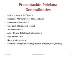 Este documento resume las características de la presentación pélvica o de nalgas en el parto, incluyendo su definición, modalidades, etiología, diagnóstico, manejo y mecanismo. Explica que la presentación pélvica ocurre cuando el polo pélvico del feto se ofrece primero al canal de parto, y representa alrededor del 2% de los partos. Describe los diferentes tipos de presentación pélvica incompleta y completa, así como los factores que pueden impedir la ley de acomodación