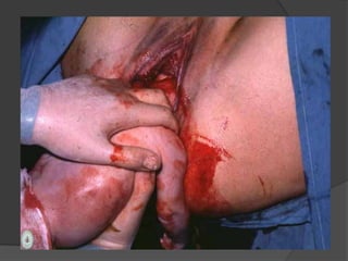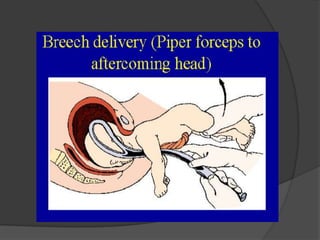 Este documento describe la presentación podálica o de nalgas en el parto, incluyendo sus variedades, etiología, mecanismo, tiempos y manejo. Se da en el 3-4% de los partos y conlleva mayor riesgo que la presentación cefálica. Requiere que cada parte del cuerpo fetal (nalgas, hombros y cabeza) realicen los cuatro tiempos de acomodación, descenso, rotación interna y desprendimiento a través del canal de parto, en un total de diez tiempos. El punto de