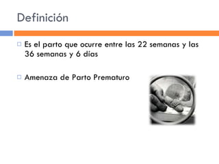 El documento describe el parto prematuro, definido como el parto que ocurre entre las 22 semanas y las 36 semanas y 6 días. Explica las causas y factores de riesgo del parto prematuro, así como los métodos de diagnóstico e índices predictivos. Finalmente, detalla los tratamientos farmacológicos utilizados para detener la progresión del parto prematuro, incluyendo tocolíticos, corticoides y antibióticos. El objetivo principal del ginecólogo ante una amenaza de parto pretérmino
