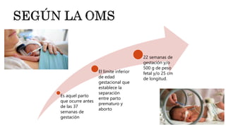 El documento presenta información sobre el parto prematuro, incluyendo su definición, factores de riesgo, complicaciones, tratamiento y prevención. Define el parto prematuro como aquel que ocurre antes de las 37 semanas de gestación, y describe las diferentes clasificaciones y niveles de severidad. Explica los enfoques de prevención primaria y secundaria, así como las opciones de tratamiento farmacológico y quirúrgico.