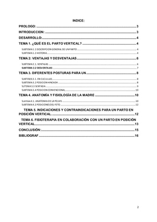 Este documento resume las ventajas y desventajas del parto vertical, así como diferentes posiciones para el parto y aspectos anatómicos y fisiológicos relevantes. Explica que el parto vertical se refiere a posiciones donde el tronco de la madre forma un ángulo de 45-90 grados con el suelo, como estar parada, sentada o de rodillas. Destaca que estas posiciones aprovechan mejor la gravedad y la anatomía de la pelvis para facilitar el parto de forma más natural, aunque algunos hospitales no cuentan con