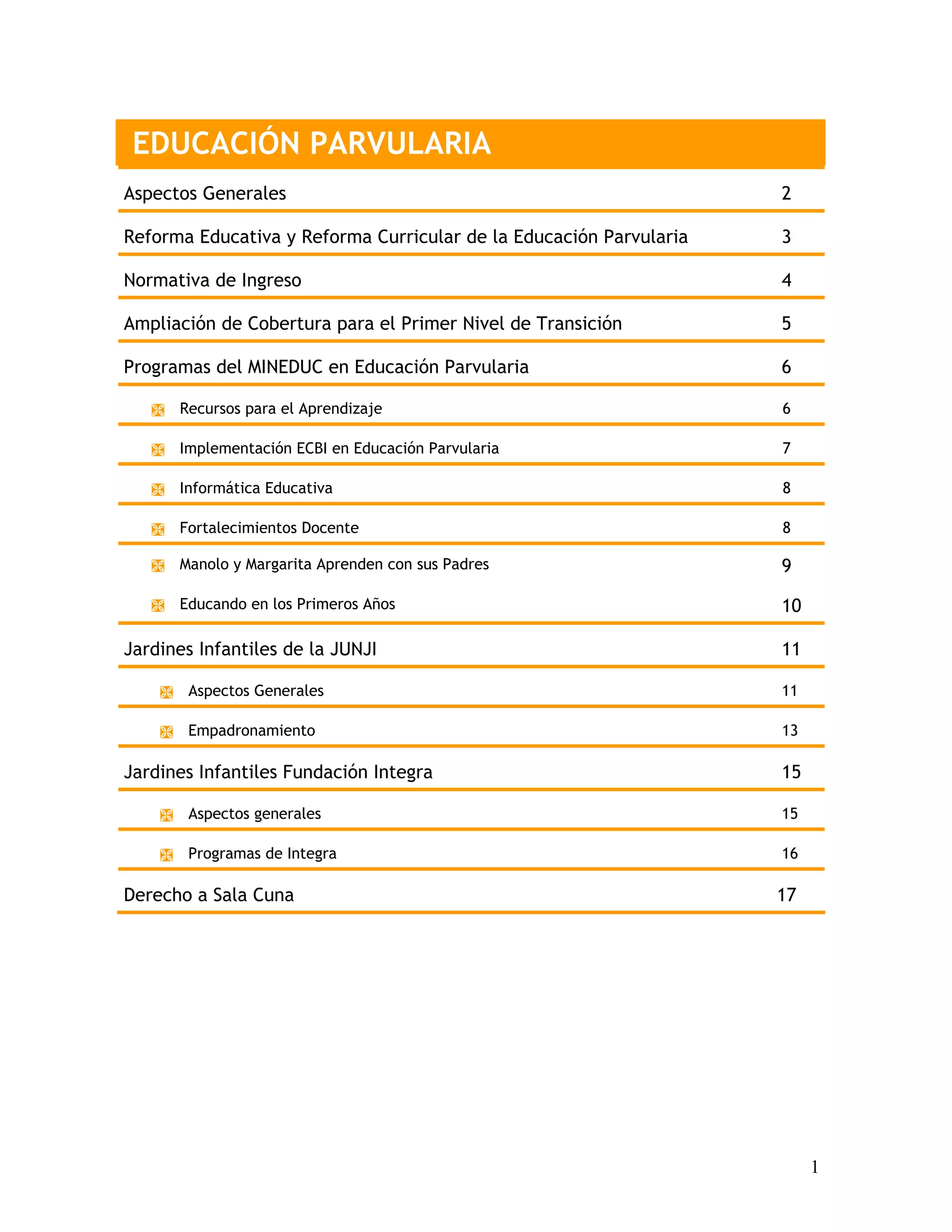 Este documento proporciona información sobre la educación parvularia en Chile. Explica que la educación parvularia es el primer nivel del sistema educativo chileno y atiende a niños desde su nacimiento hasta los 6 años de edad. También describe los programas y reformas del Ministerio de Educación para mejorar la calidad de la educación parvularia, como la ampliación de cobertura, recursos para el aprendizaje, e implementación de programas como ECBI. Además, brinda detalles sobre los niveles, normativa de ing