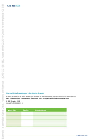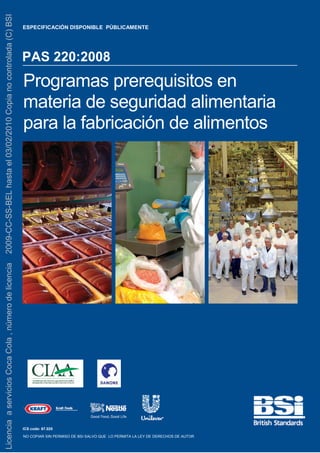 Este documento presenta los requisitos para programas prerequisitos en materia de seguridad alimentaria para la fabricación de alimentos según la norma PAS 220:2008. Incluye términos y definiciones relevantes, y se refiere a otras normas como BS EN ISO 22000:2005. El alcance incluye requisitos detallados para la construcción, diseño de instalaciones, servicios, equipos, higiene personal, control de plagas y más.