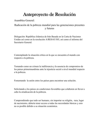 El documento propone modificar el Banco Mundial y el FMI para otorgar préstamos más favorables a países en desarrollo, fomentar el desarrollo de recursos propios para reducir la dependencia externa, y aumentar la inversión en educación y reducir el gasto militar para ayudar a erradicar la pobreza mundial.