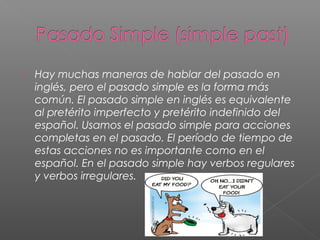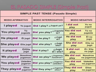 El documento habla sobre la formación del pasado simple en inglés. Explica que se usa para acciones completas en el pasado sin importar el período de tiempo. Incluye verbos regulares que terminan en "-ed" y verbos irregulares que cambian. También cubre la formación del pasado simple del verbo "to be" y da ejemplos de oraciones en el pasado simple.