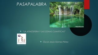 Este documento presenta un crucigrama sobre la atmósfera y las zonas climáticas. El crucigrama incluye claves sobre la composición de la atmósfera, las capas atmosféricas, los instrumentos meteorológicos y los bioclimas característicos de diferentes regiones.