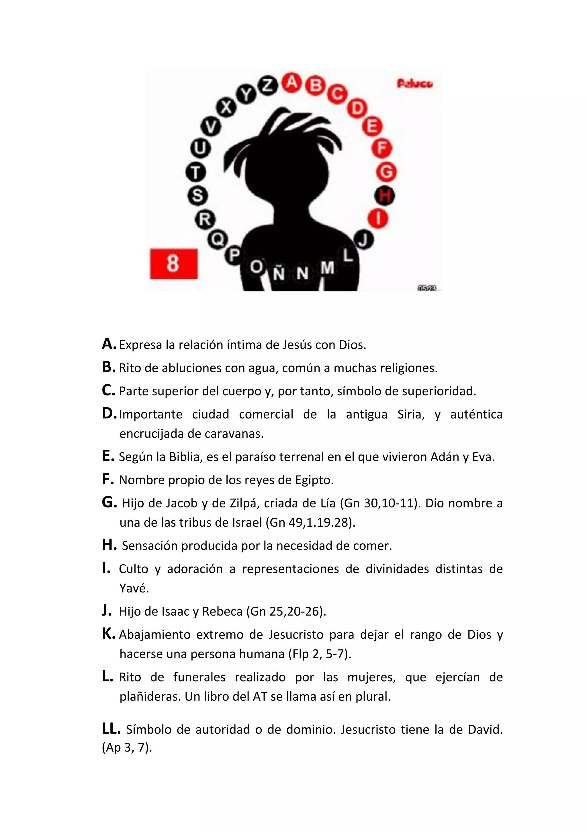 El documento presenta una lista de 26 términos relacionados con la Biblia y la religión cristiana, identificados por letras del alfabeto. Los términos incluyen nombres propios como Jesús, Jacob y Pablo, conceptos como bautismo, Edén e idolatría, y libros como Éxodo y Lamentaciones.