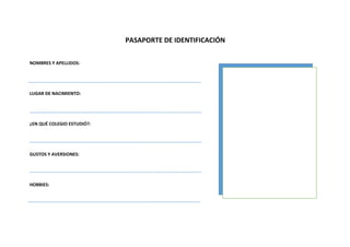 Este documento contiene información básica sobre una persona incluyendo su nombre completo, lugar de nacimiento, colegio donde estudió, gustos y aversiones, y pasatiempos.