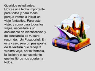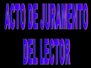El documento presenta un juramento del lector que los estudiantes realizarán para iniciar un viaje a través de la lectura. En el juramento, los estudiantes prometen cuidar los libros, buscar aventuras e historias en ellos, consultar diversos materiales para alimentar su inteligencia, y tener un libro como compañero para enriquecerse. También prometen acudir a la biblioteca para descubrir emociones a través de la literatura y difundir las bondades de la lectura.