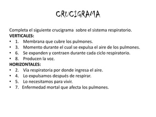 El documento presenta un crucigrama y unas adivinanzas relacionadas con el sistema respiratorio. El crucigrama contiene palabras clave como pulmones, expirar, respirar y voz. Las adivinanzas describen los pulmones, la nariz y los pulmones respectivamente.