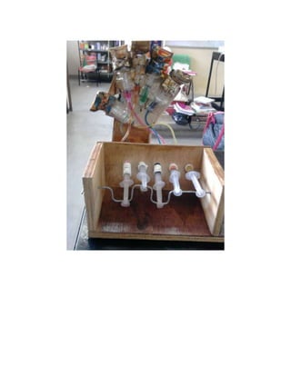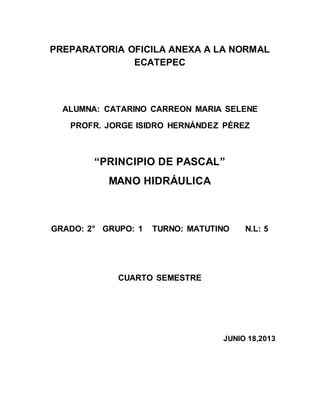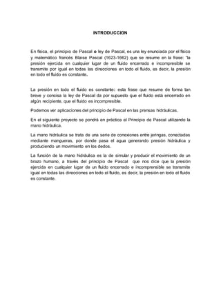Este documento describe un proyecto que demuestra el Principio de Pascal utilizando una mano hidráulica. El proyecto consiste en dos jeringas de diferentes tamaños conectadas por una manguera y llenas de agua. Al presionar el émbolo de la jeringa más pequeña, el agua presiona con igual intensidad en la jeringa más grande, moviendo su émbolo, demostrando que la presión se transmite por igual en todo el fluido. El proyecto simula el movimiento de los dedos de una mano a través de