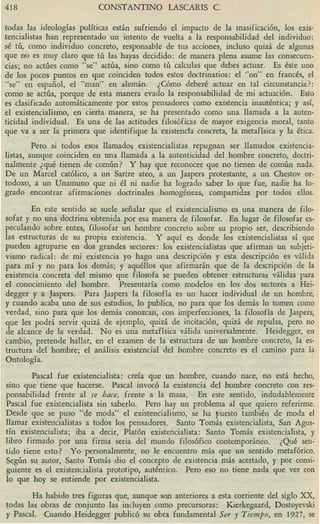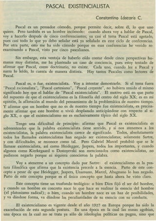 Este documento discute si Pascal puede considerarse un pensador existencialista. Presenta las posiciones de varios conferenciantes sobre Pascal y argumenta que Pascal fue existencialista en el sentido de que creía que cuando un hombre nace no está hecho sino que tiene que hacerse a sí mismo, asumiendo responsabilidad por sus acciones. Sin embargo, también argumenta que Pascal fue un racionalista radical al fundamentar la razón en la voluntad divina y enfatizar que toda la dignidad humana consiste en el pensamiento.
