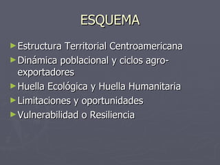 El documento examina los límites e impactos ambientales de la acumulación en Centroamérica, destacando el cambio en el uso de la tierra, la urbanización y las dinámicas migratorias influenciadas por conflictos y economías agro-exportadoras. También se abordan las vulnerabilidades en las zonas rurales, donde la pobreza extrema es prevalente, y los retos para una gestión sostenible del territorio, enfatizando la necesidad de colaboración entre sectores público y privado. Se proponen estrategias para mejorar la resiliencia y la seguridad alimentaria, así como la integración de nuevos actores en la planificación y gestión de recursos naturales.