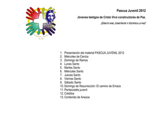 El documento presenta información sobre la celebración del Domingo de Ramos en la Semana Santa. Se explica que en este día se conmemora la entrada triunfal de Jesús a Jerusalén, donde la multitud lo recibió con ramos de palma como señal de que lo reconocían como el Mesías prometido. También se lee el pasaje de la Pasión para recordar el sacrificio de Jesús por la humanidad. El objetivo es reconocer a Jesús como el Príncipe de Paz y proclamarlo como nuestro Rey.