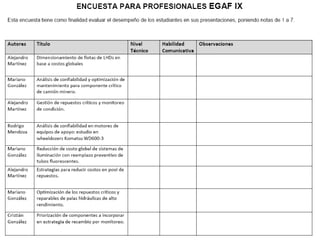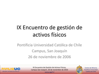Este documento proporciona información sobre el IX Encuentro de Gestión de Activos Físicos que se llevará a cabo el 26 de noviembre de 2010 en el Campus San Joaquín de la Pontificia Universidad Católica de Chile. El evento incluirá presentaciones de invitados especiales como el Contraalmirante Giancarlo Stagno Canziani y varios doctores y profesores. El objetivo del encuentro es promover el intercambio de conocimientos sobre la gestión de activos y la eficiencia energética.