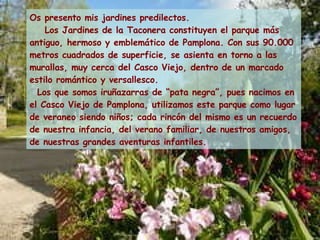 Este documento presenta los jardines favoritos del autor en Pamplona, llamados Los Jardines de la Taconera. Describe estos jardines como el parque más antiguo, hermoso y emblemático de la ciudad, que ocupa 90,000 metros cuadrados cerca del Casco Viejo. El autor recuerda su infancia jugando en estos jardines y los recuerdos con amigos de esa época. Además, incluye fotos que muestran los cambios de primavera en la ciudad en sólo 10 días, grupos de danzas tradicional