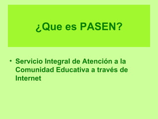 PASEN es un servicio que permite la comunicación entre centros educativos, alumnado, profesorado y familias. Ofrece acceso a notas, horarios, ausencias, tareas y exámenes del alumnado, así como calendario escolar, comunicaciones y agenda personal. El objetivo es facilitar el seguimiento escolar y mejorar las relaciones entre la escuela y las familias.