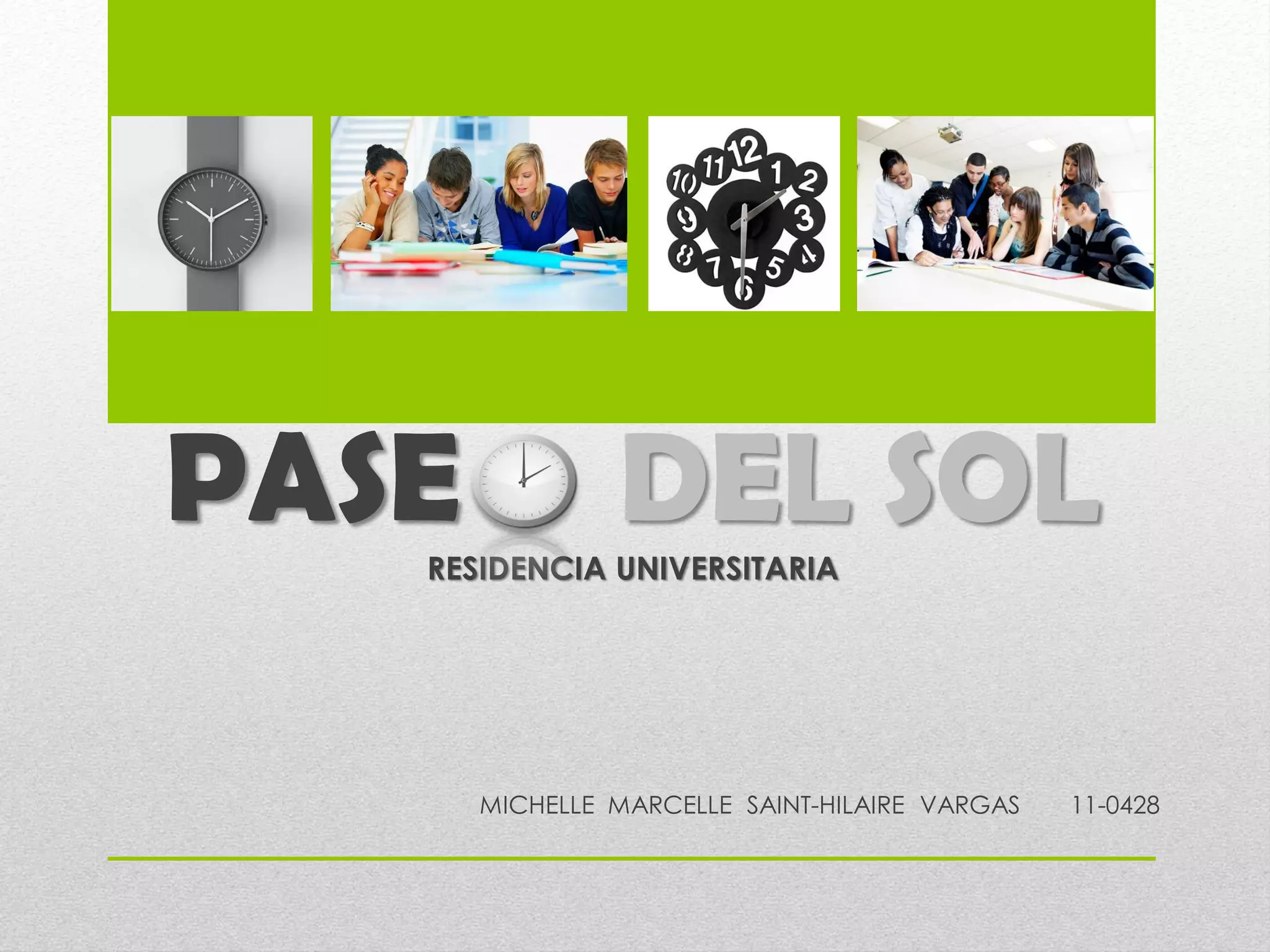 Este documento presenta un proyecto para crear una residencia estudiantil fuera del campus universitario en Santo Domingo que ofrezca alojamiento y servicios complementarios a estudiantes universitarios de 16 a 25 años. La residencia contará con tres bloques que albergarán dormitorios y áreas comunes como administración, biblioteca, gimnasio, cafetería y auditorio/cine. El diseño aplicará un estilo ecléctico y utilizará un esquema de colores neutros con énfasis en tonos verdes y azules.