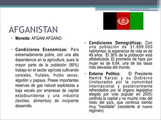El documento proporciona un análisis económico, demográfico y político de varios países, destacando sus condiciones actuales. Se presentan datos sobre la población, esperanza de vida, y los sectores económicos predominantes, como agricultura, turismo, y recursos naturales. Además, se mencionan las estructuras políticas y el contexto legislativo de cada nación.