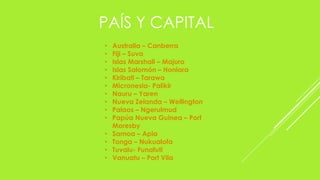 Este documento proporciona información sobre varios países de Oceanía, incluyendo sus capitales, idiomas oficiales, monedas, montañas, ríos, lagos, climas, ciudades importantes, recursos naturales, jefes de gobierno, conflictos y dictaduras. Cubre 14 países de la región del Pacífico Sur y presenta datos clave sobre cada uno.