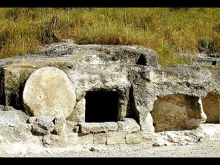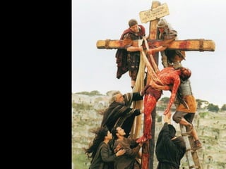 Este documento narra los últimos días de Jesús, desde la Última Cena hasta su crucifixión y resurrección. Describe cómo Jesús lavó los pies de sus discípulos, instituyó la Eucaristía y oró en Getsemaní antes de ser arrestado por Judas y llevado ante los sumos sacerdotes. Luego fue juzgado por Poncio Pilato y condenado a muerte, crucificado en el Gólgota junto a dos ladrones y sepultado por José de Arimatea, para finalmente resucitar al tercer día.
