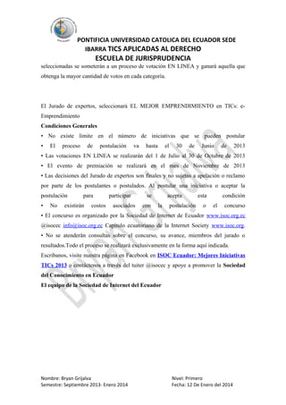 Este documento anuncia la nueva edición del concurso "Mejores Iniciativas TICs del Ecuador 2013", el cual selecciona y premia las mejores aplicaciones e iniciativas nacionales en áreas como e-educación, e-salud, e-gobierno, entre otras. Las iniciativas pueden postularse enviando información a info@isoc.org.ec y serán evaluadas por un jurado de expertos. Las finalistas serán sometidas a votación pública online para determinar a los ganadores.