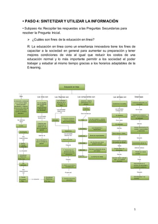 El documento resume los pasos para investigar y sintetizar información sobre la educación en línea. Explica que la educación en línea tiene como objetivos capacitar a la sociedad, aumentar su preparación y reducir los costos de la educación, permitiendo estudiar y trabajar al mismo tiempo. Resume los componentes de la educación en línea y sus ventajas y desventajas.