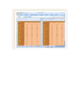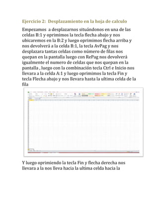 Este documento contiene una serie de ejercicios prácticos sobre el uso de hojas de cálculo de Excel. Los ejercicios cubren temas como desplazamiento dentro de una hoja, uso de pestañas, introducción y formato de datos, operaciones con archivos, funciones de fechas, copiar y pegar celdas, formato de fuentes y filas, inserción de elementos, corrección ortográfica, impresión, creación de gráficos, manipulación de imágenes y uso de esquemas y vistas. El documento proporcion