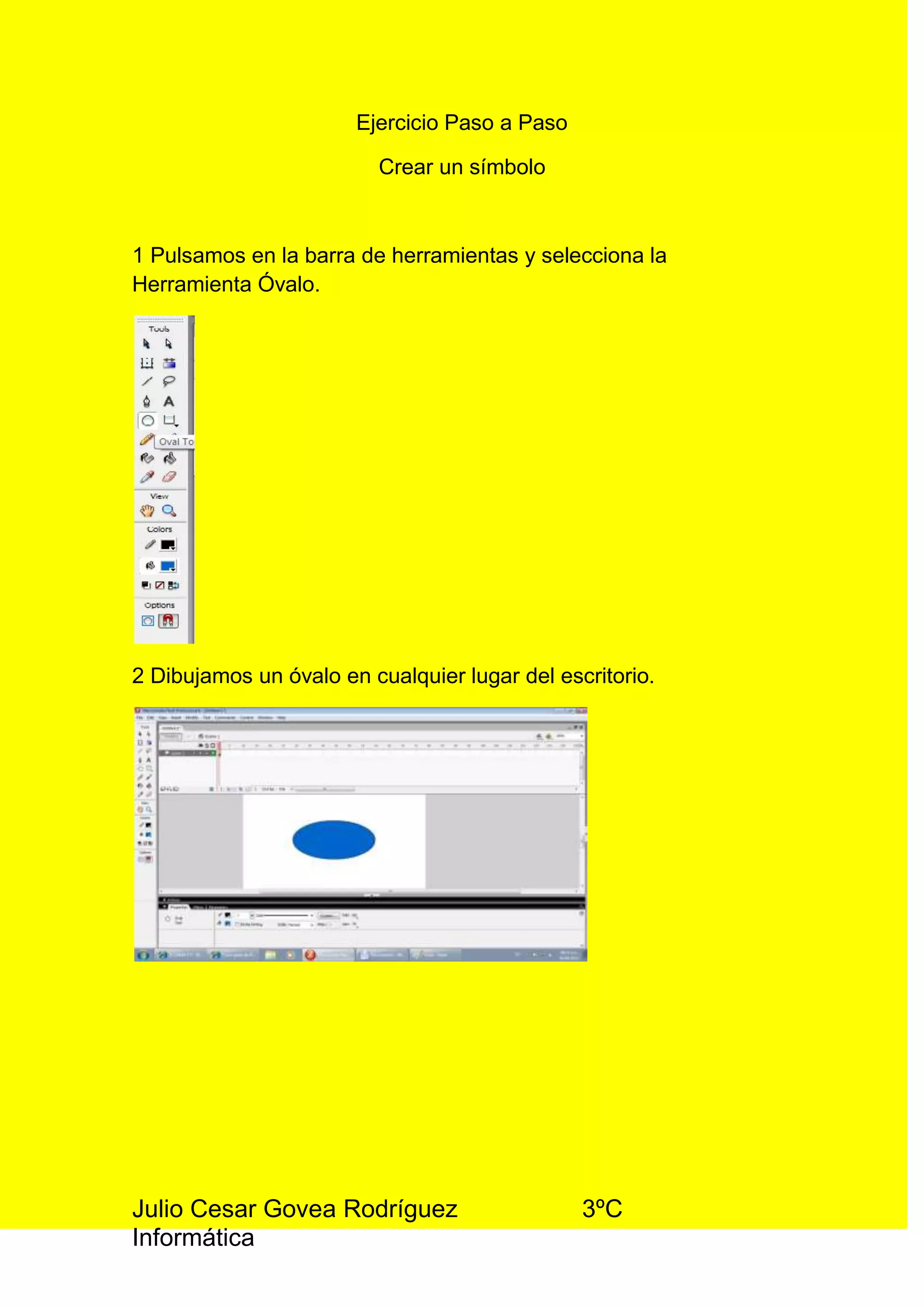 El documento describe los pasos para crear un símbolo en Flash. Estos incluyen 1) dibujar un óvalo en el escritorio, 2) seleccionar la figura, y 3) crear un nuevo símbolo asignándole un nombre y configurándolo como un gráfico.