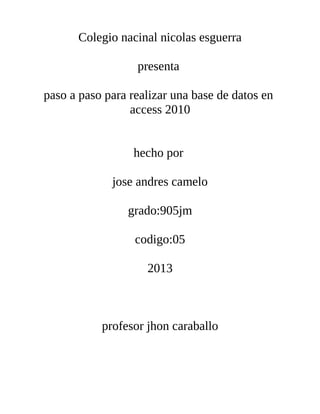 El documento presenta un resumen de 5 pasos para crear una base de datos en Access 2010, incluyendo (1) abrir el programa Access 2010, (2) nombrar la tabla inicial como "clientes", (3) agregar campos para el nombre y apellido en la tabla, (4) ajustar el ancho de los campos, y (5) guardar y ver la base de datos completada.