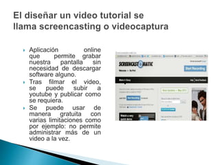 El documento describe los requisitos para crear video tutoriales efectivos, incluyendo software que permita grabar la pantalla y audio, y opciones para marcar áreas y agregar transiciones. También enfatiza la importancia de definir objetivos claros, estructura y contenido para la guía paso a paso. Además, recomienda considerar alternativas antes de crear el video y desarrollar un guión que incluya título, objetivos, contenido detallado paso a paso y conclusiones.