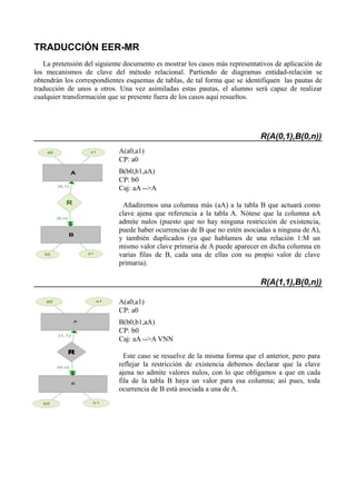 Este documento describe los pasos para traducir diagramas entidad-relación a esquemas de tablas relacionales. Explica cómo añadir claves primarias y ajenas a las tablas para representar diferentes tipos de relaciones como 1:1, 1:N, N:M y agregaciones. Proporciona ejemplos detallados de cada caso y las pautas para transformar diagramas EER a esquemas de bases de datos relacionales.