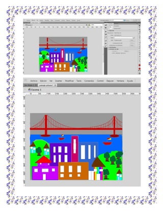 El documento describe los pasos para crear un paisaje en Adobe Flash usando herramientas como rectángulos, óvalos y líneas. Primero se eligió un fondo gris y luego se usaron las herramientas de rectángulo para crear casas y polígonos para hacer techos. Se agregaron ventanas, árboles y nubes usando óvalos. Líneas se usaron para un puente y las herramientas de pintura para colorear el cielo y nubes.