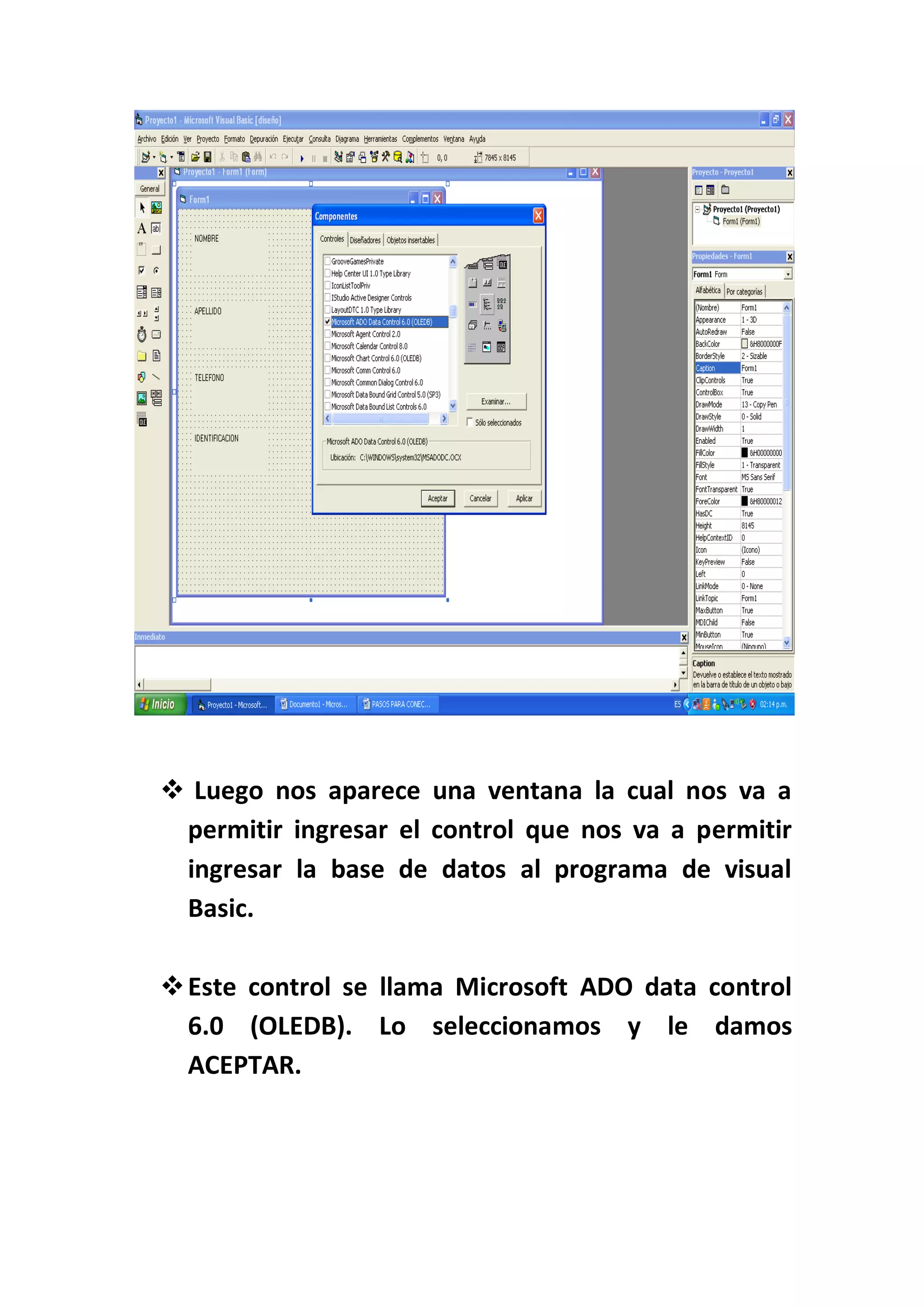 El documento describe los pasos para conectar una base de datos en Microsoft Access a un formulario en Visual Basic. Estos incluyen: 1) agregar un control ADO para conectarse a la base de datos, 2) configurar la cadena de conexión para seleccionar la base de datos, y 3) asignar los campos de la base de datos a los controles como cajas de texto en el formulario.
