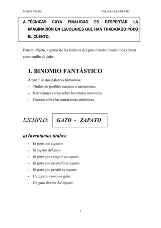 Este documento presenta varias técnicas para la creación y recreación de cuentos en el aula. Se dividen las técnicas en dos grupos: aquellas cuyo objetivo es despertar la imaginación de los estudiantes, como el binomio fantástico y las hipótesis fantásticas; y aquellas que ayudan a estructurar una historia, como los cuentos guiados, llenar una estructura dada y modificar elementos narratológicos. Se explican detalladamente cada una de las técnicas con ejemplos para