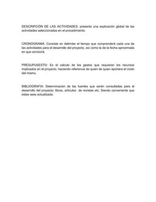 Este documento describe los pasos clave para elaborar un anteproyecto. Un anteproyecto es una versión preliminar de un proyecto que se presenta para revisión y aprobación antes de convertirse en un proyecto formal. Los pasos incluyen definir el título, antecedentes, problema, justificación, objetivos, alcances y limitaciones, procedimientos, actividades, cronograma, presupuesto y bibliografía. Una vez aprobado, el anteproyecto se convierte en el proyecto formal.