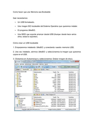 El documento proporciona instrucciones para formatear un disco duro y crear un USB booteable para instalar un sistema operativo. Explica cómo insertar el CD de Windows sin instalarlo, reiniciar desde el CD, formatear y eliminar particiones existentes, e instalar Windows. También describe cómo acceder al BIOS, seleccionar una unidad de CD o USB como primera opción de arranque, y guardar los cambios para iniciar la instalación desde el dispositivo externo.