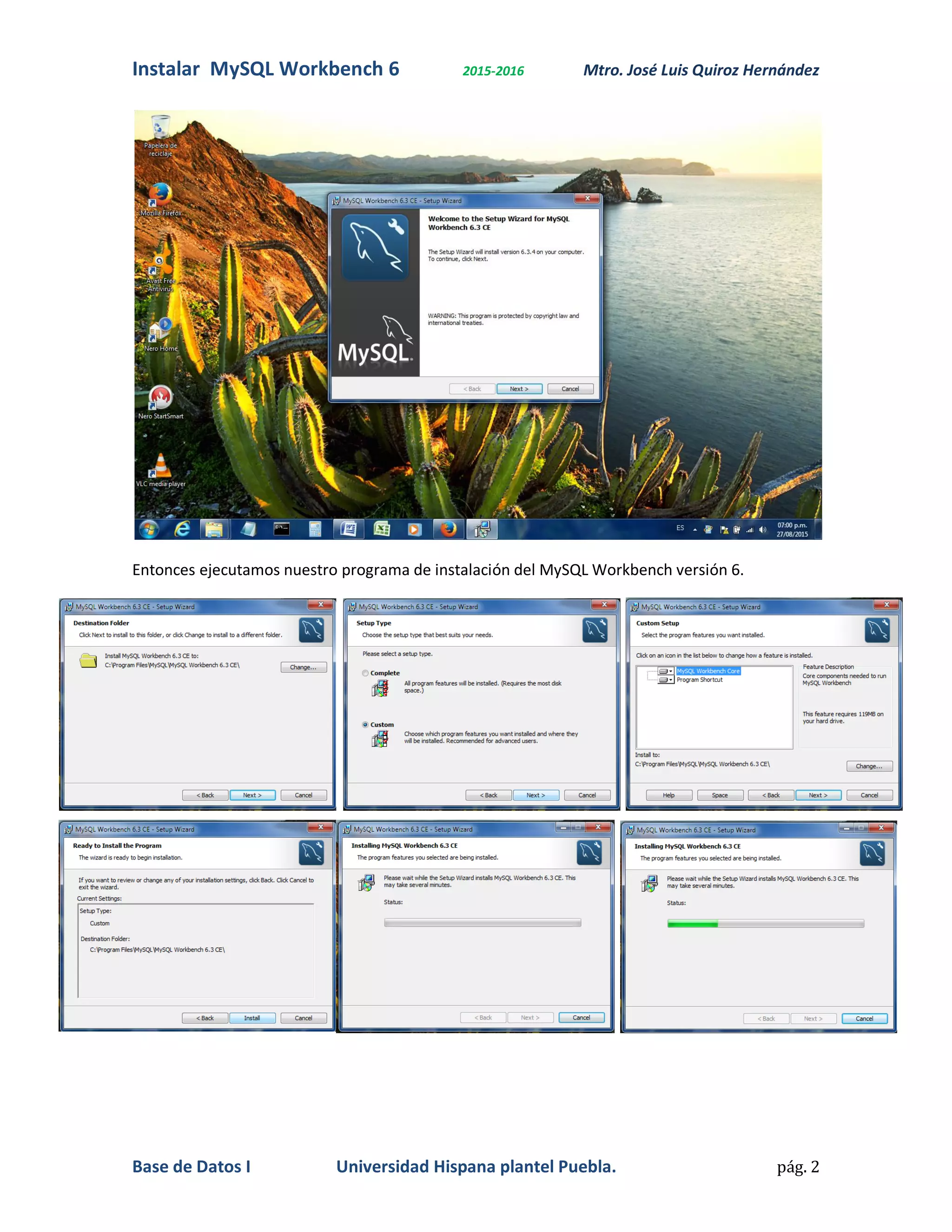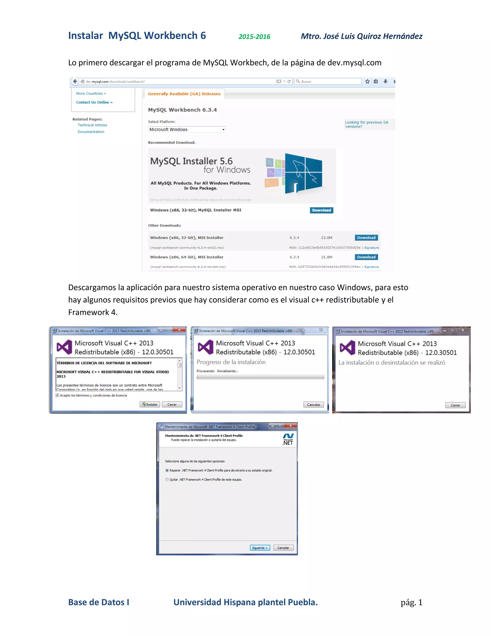 El documento describe los pasos para instalar MySQL Workbench y el servidor MySQL en Windows. Primero se debe descargar e instalar MySQL Workbench. Luego, se descarga e instala el servidor MySQL Community Server. Finalmente, se configura el servidor MySQL y se crean cuentas de usuario antes de probar la conexión entre Workbench y el servidor.