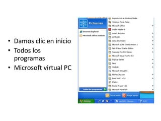El documento proporciona instrucciones para instalar Windows 2000 en una máquina virtual, incluyendo dar clic en Nuevo para crear un equipo virtual, asignarle RAM y un disco duro, seleccionar Windows 2000 como el sistema operativo, formatear el disco duro en NTFS, copiar los archivos del sistema operativo, e iniciar la instalación para configurar la zona horaria y licencia.