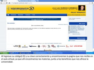 El documento proporciona instrucciones sobre cómo usar las herramientas de aprendizaje en línea en la Universidad Uniminuto, incluyendo cómo acceder al aula virtual, participar en foros, usar el correo electrónico estudiantil y las herramientas de Google Drive como presentaciones y documentos en línea. Explica cómo crear y compartir archivos y presentaciones con otros estudiantes usando estas herramientas.