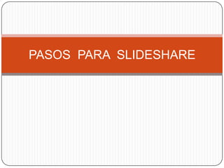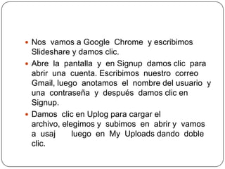 Para crear una cuenta en Slideshare y subir un archivo, se debe ingresar a la página web de Slideshare desde Google Chrome, crear una cuenta con un correo Gmail, nombre de usuario y contraseña, luego cargar el archivo seleccionado haciendo clic en "Uplog" y encontrarlo en la sección "My Uploads".