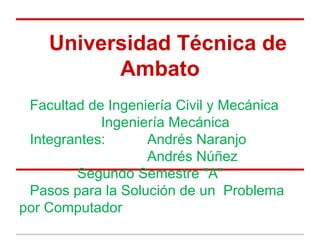 Este documento describe los pasos para la solución de un problema por computador, incluyendo la definición del problema, análisis, diseño de algoritmo, compilación, depuración, ejecución y mantenimiento. Explica que la solución de problemas se desarrolla mediante estos pasos para que puedan ser entendidos y resueltos por una computadora.