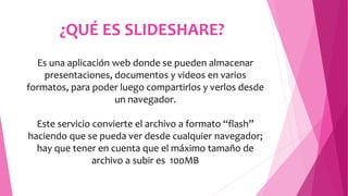 SlideShare es una aplicación web para almacenar y compartir presentaciones, documentos y videos en formato flash. Para usarla, primero debes registrarte en slideshare.net, luego hacer clic en el botón "Upload" para seleccionar el archivo a subir, y por último indicar un título, descripción, etiquetas y categoría para el archivo.