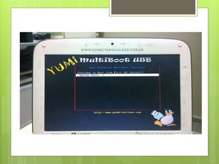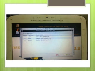 El documento proporciona instrucciones en 3 pasos para recuperar el inicio de arranque (GRUB) en las netbooks del programa utilizando la herramienta RESCATUX: 1) conectar un pendrive con el ejecutable RESCATUX y seguir las instrucciones en la pantalla, 2) seleccionar OK después de que el sistema complete los pasos de configuración, y 3) reiniciar la netbook y seleccionar la opción "SISTEMA DE RESTAURACIÓN" para restaurar ambos sistemas operativos a su estado original de fábrica