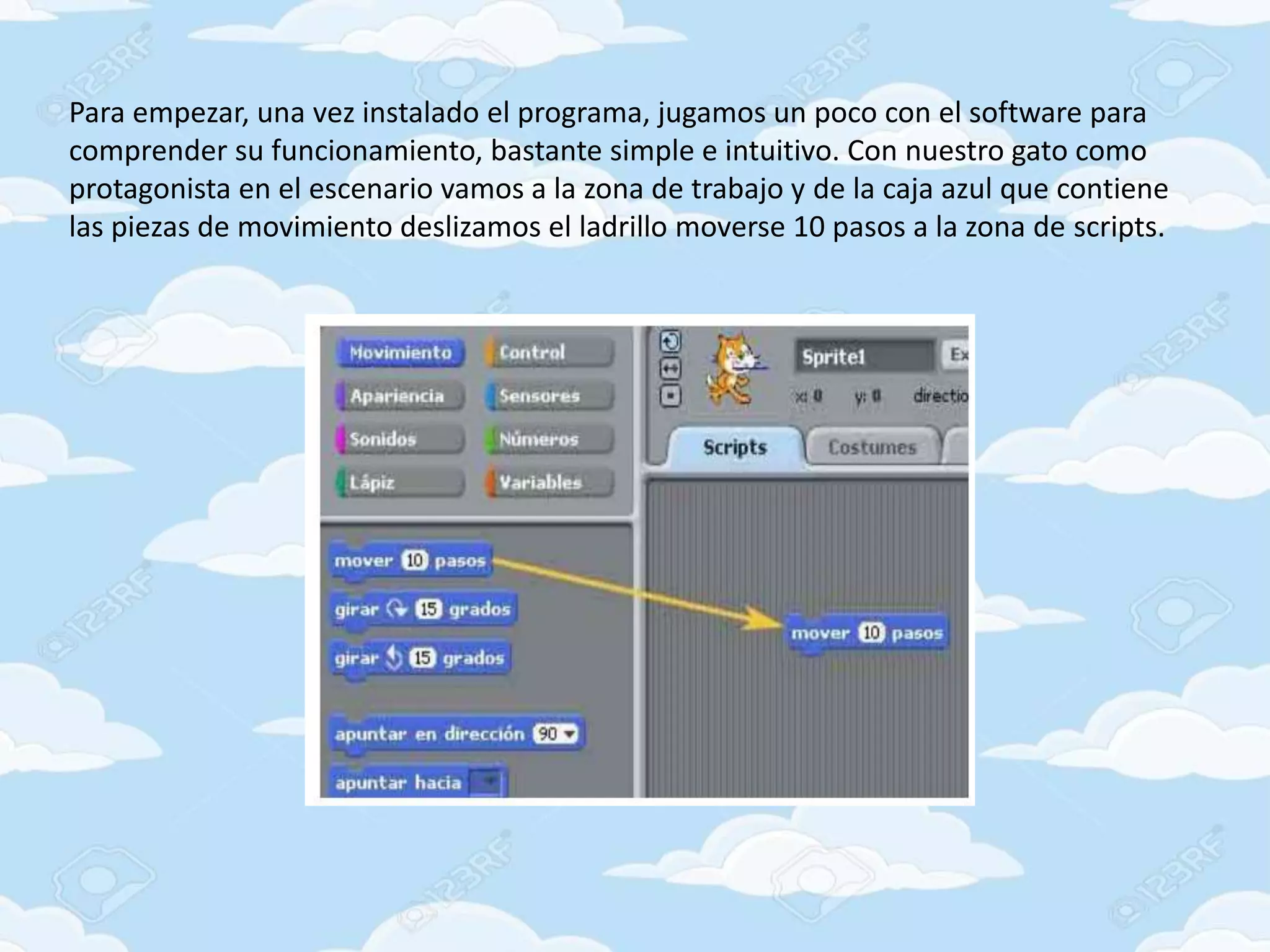 Este documento describe cómo usar un programa de programación visual para controlar el movimiento y sonido de un gato virtual en una escena. Explica cómo ensamblar bloques de código arrastrándolos para hacer que el gato se mueva y suene música. También muestra cómo añadir otro objeto, un "Fantasy 12", y programarlo para que hable y cambie de efecto cuando se pulse una tecla.